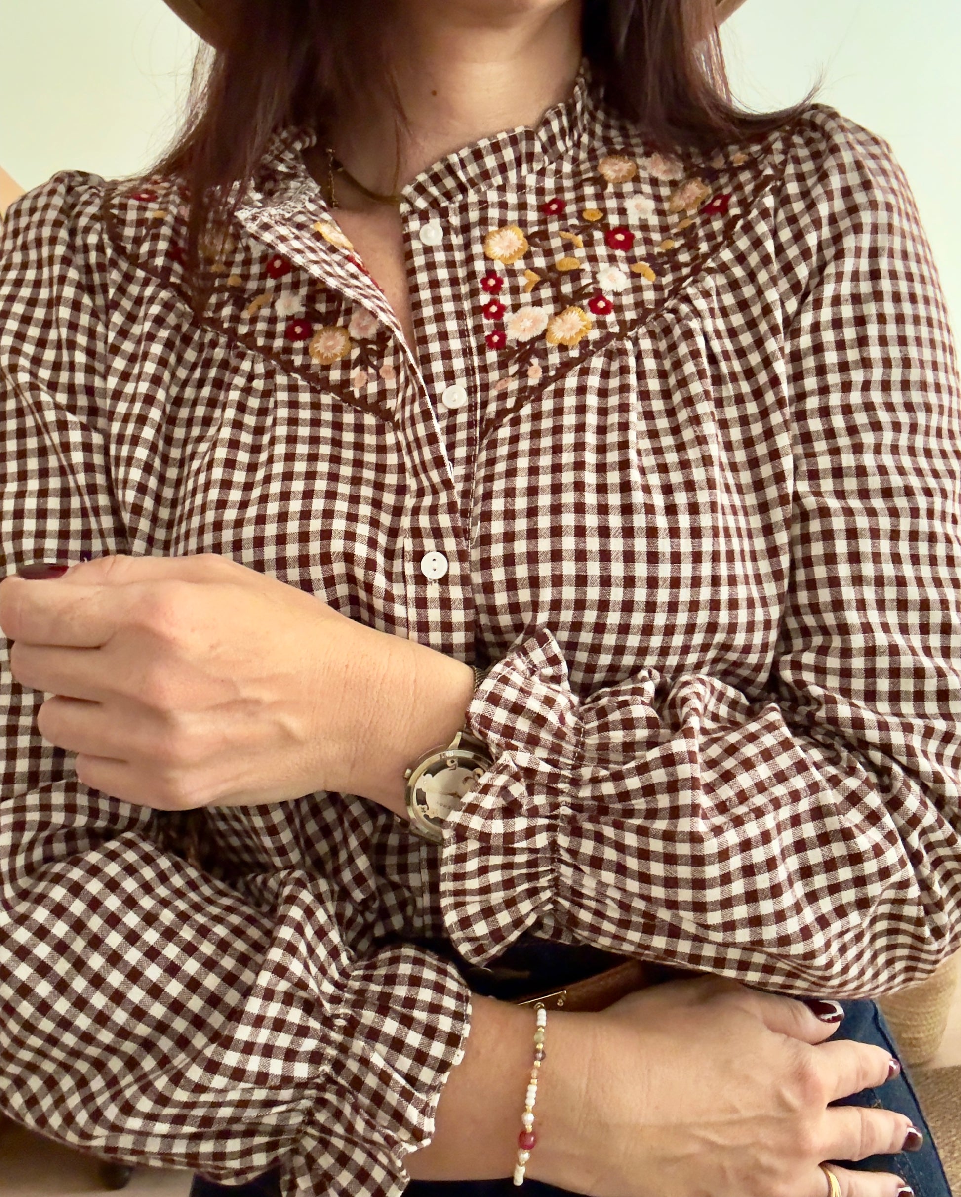 Blusa en cuadro vichy marrón con canesú bordado de flores. Puño con goma.