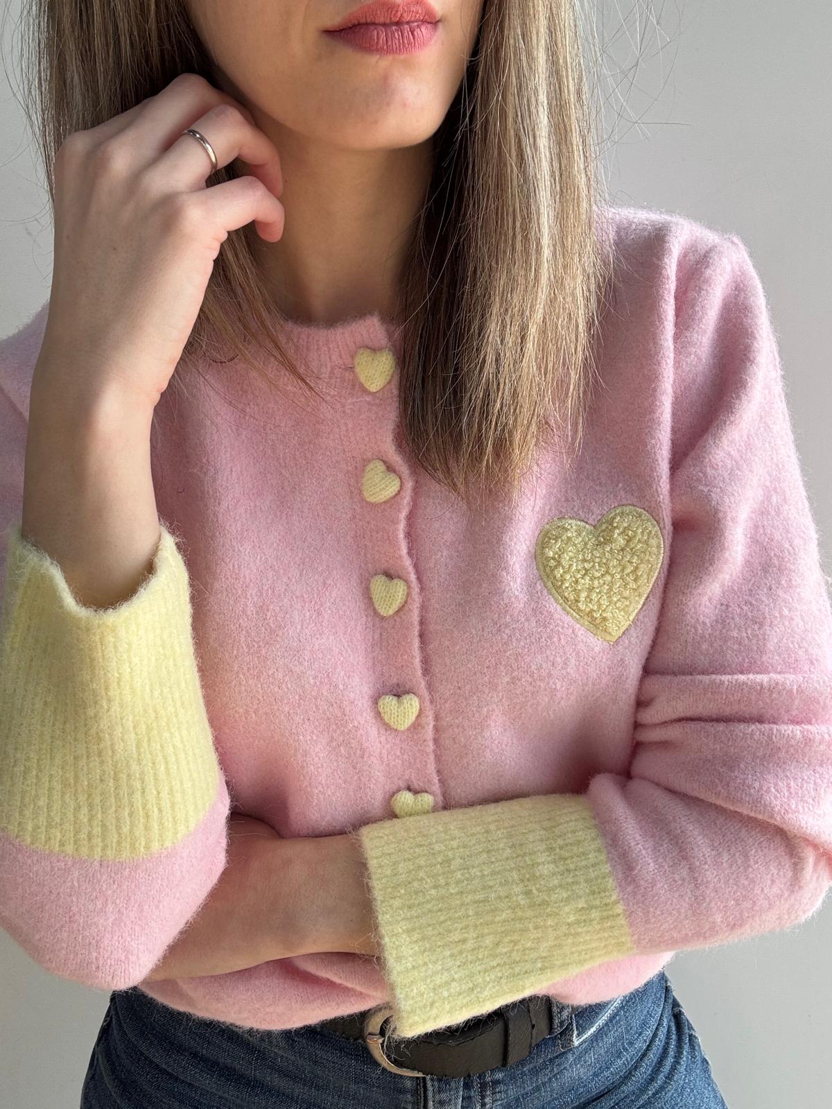 Cárdigan de lana con detalle de puño y vivos en contraste. Corazón en el pecho. Botones corazón