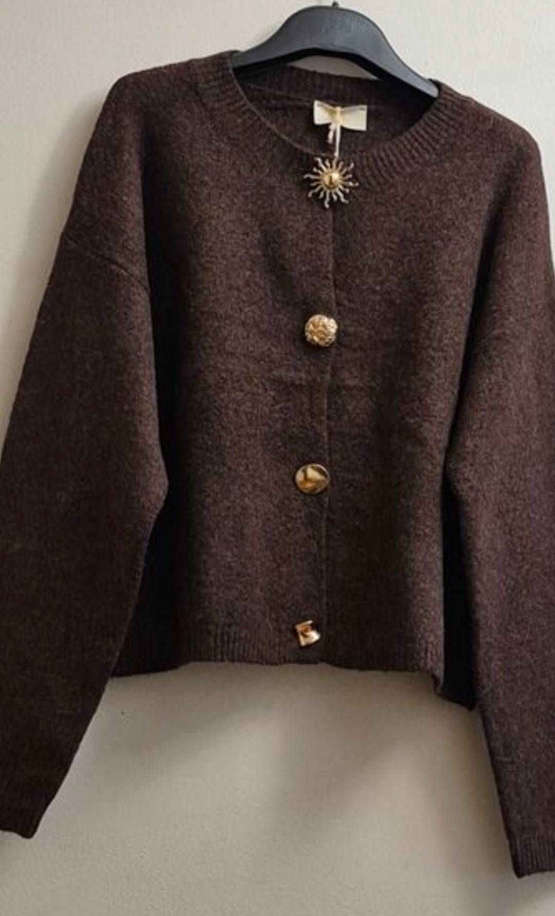 Cárdigan de lana con botones dorados. Primer botón oculto y broche con forma de sol.