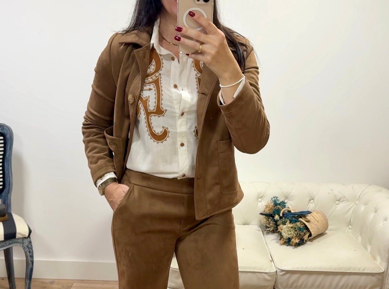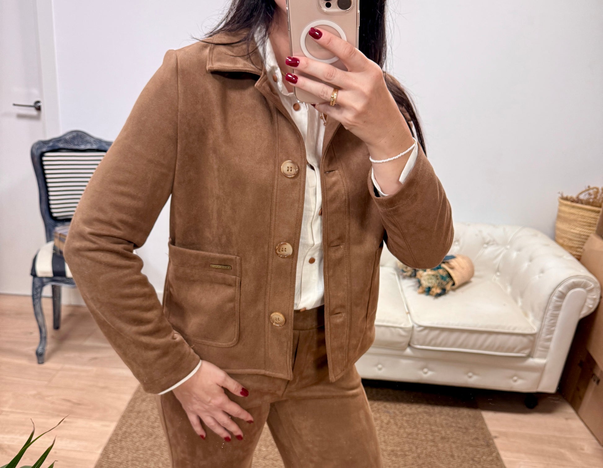 Cazadora de Angelina camel. Abotonado delantero. Forro interior.