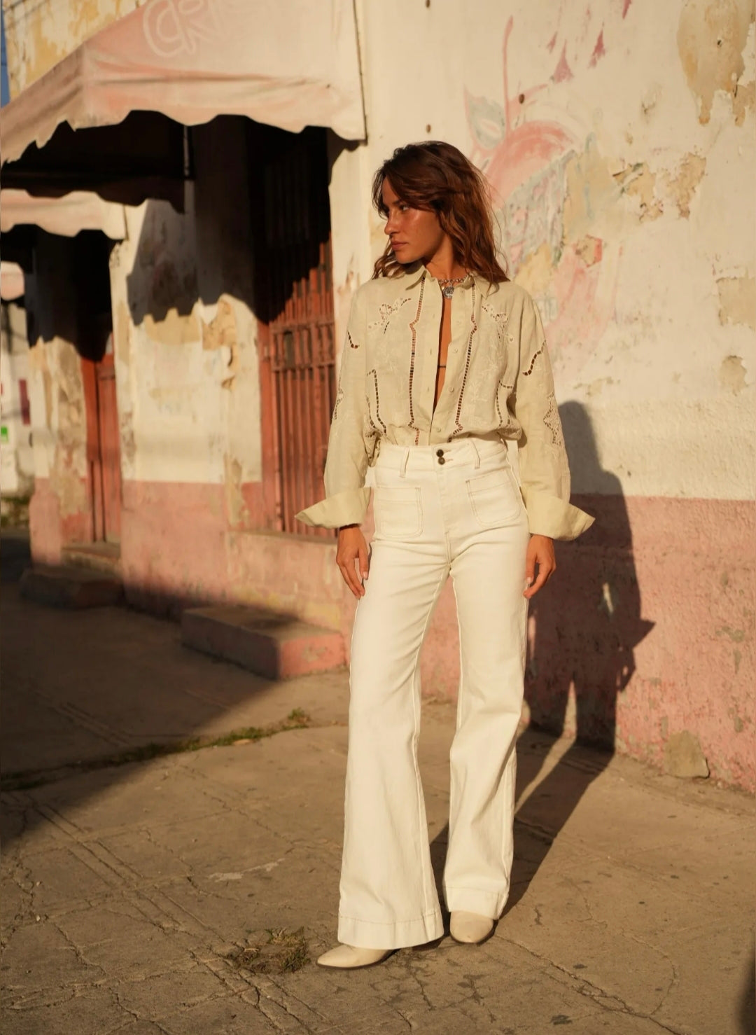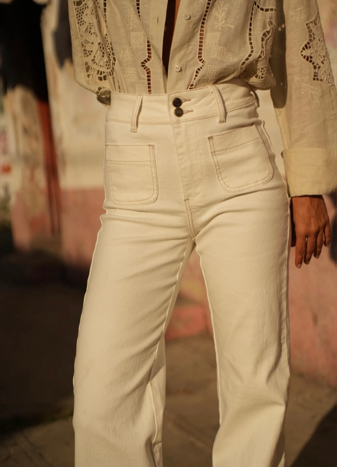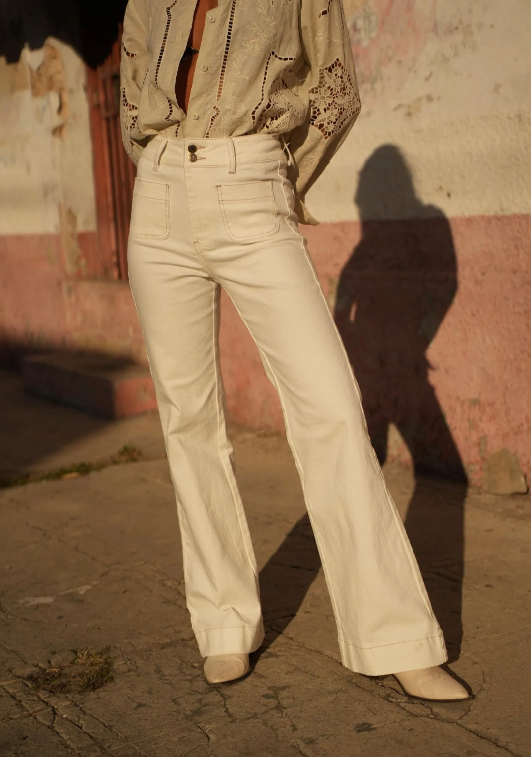 Pantalón tejano corte flared y alto de cintura. Color crudo