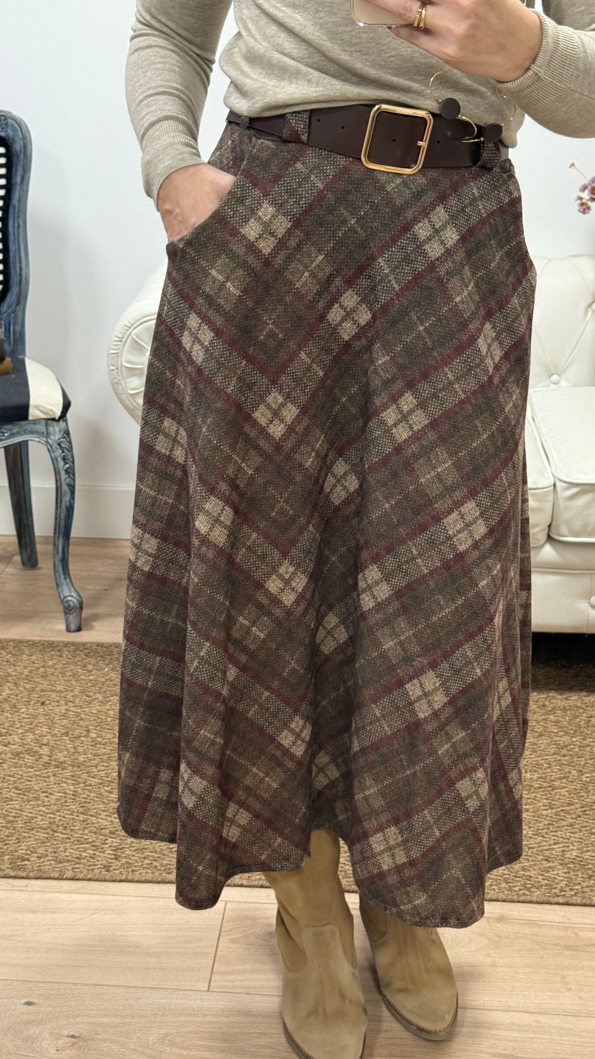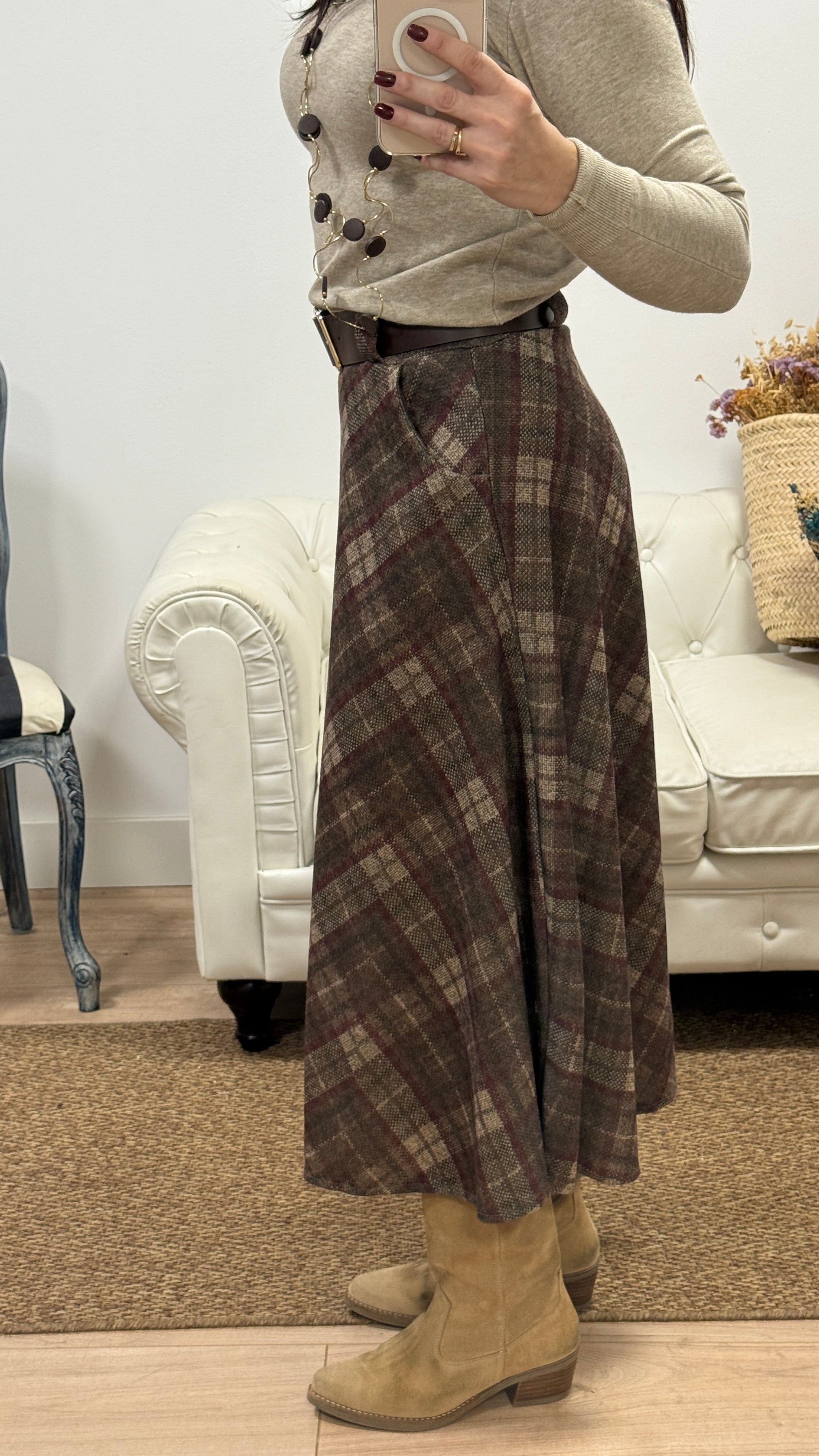 Falda en tejido de punto. Estampado de cuadros. Corte al biaix. Bolsillos, incluye cinturón