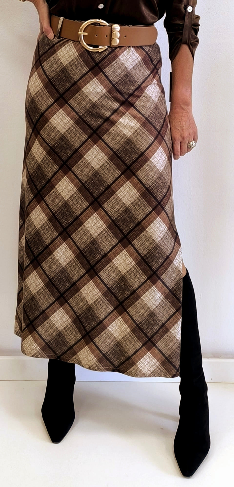 Falda larga en punto frío. Estampado de cuadros en tonos marrones, beige y negro. Cinturón incluido
