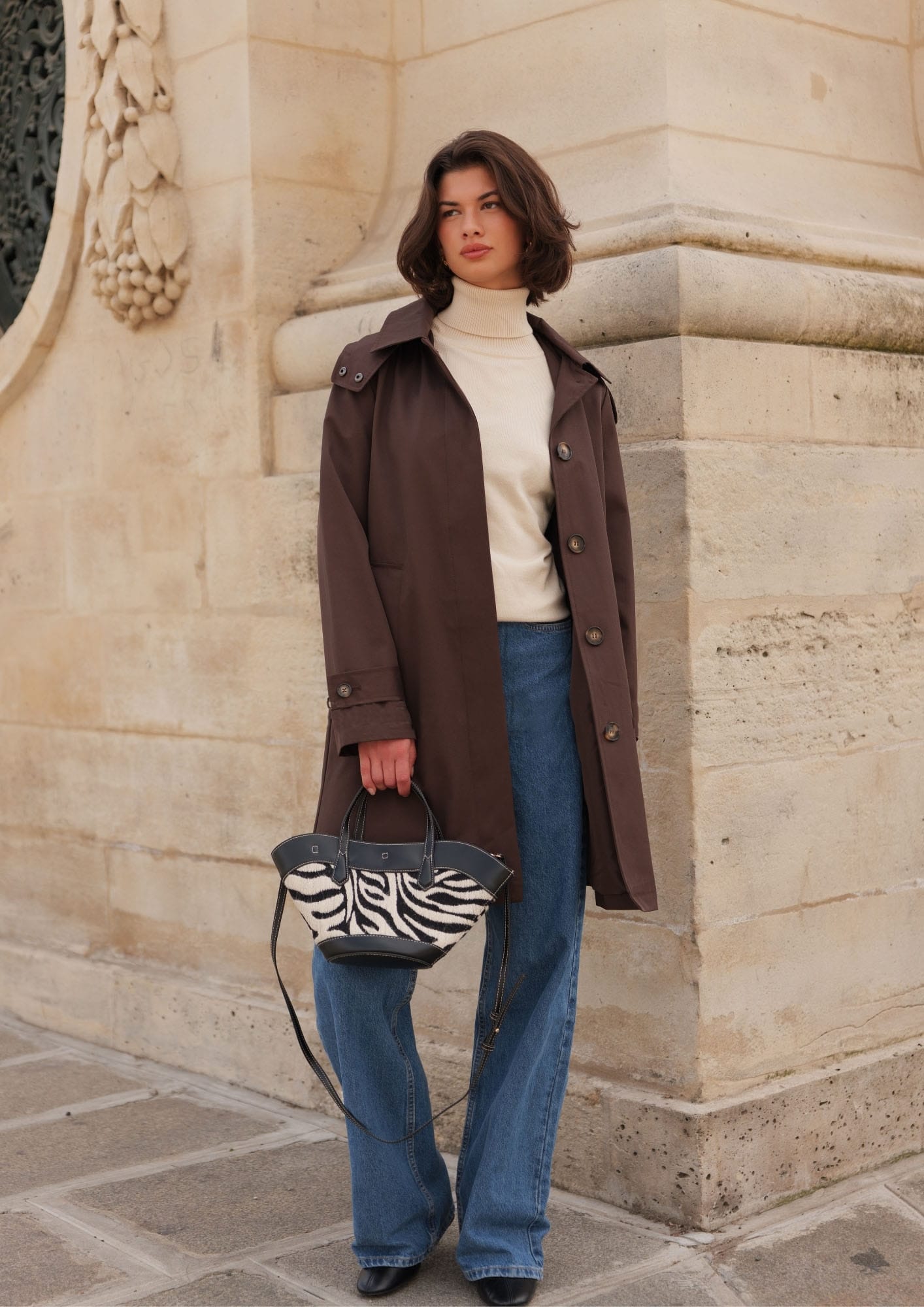 Gabardina en color marrón chocolate. Corte recto. Capucha desmontable.