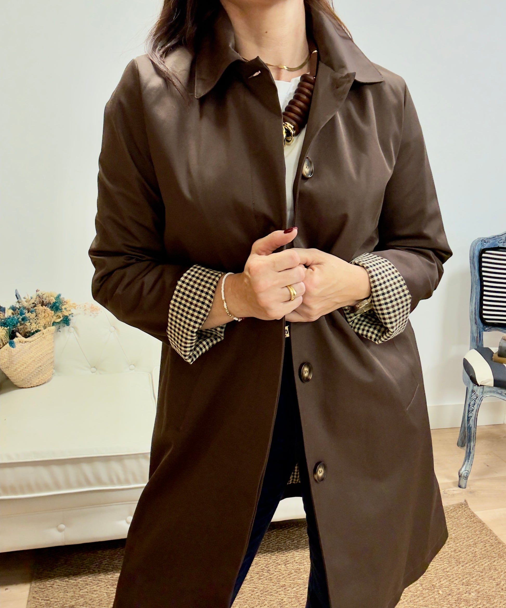 Gabardina marrón chocolate tipo oversize. Forró en cuadrito vichy