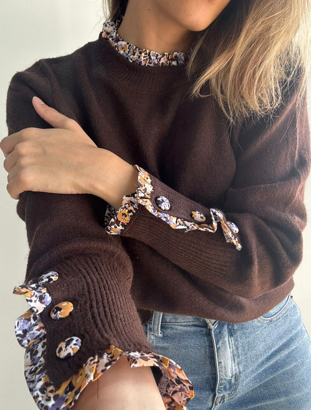 Suéter de manga larga con cuello redondo y detalles de flores liberty en el cuello, puño y zona de botones en los puños. Talla única.
