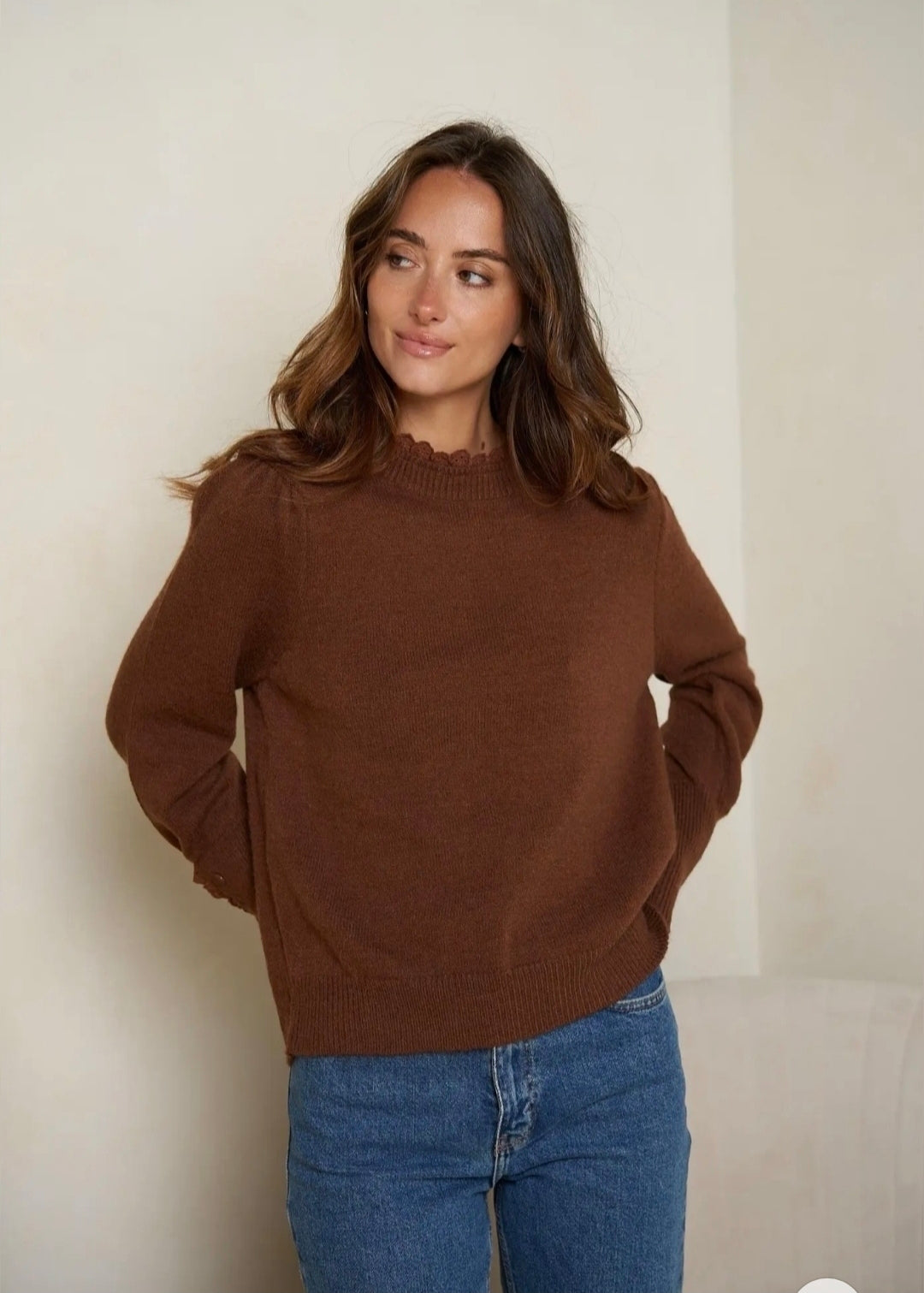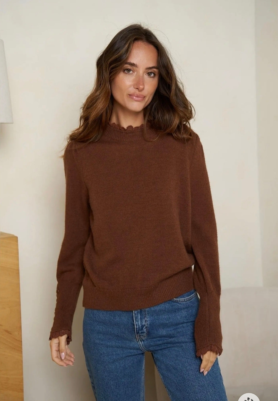 Jersey de lana con detalle de puntilla en el cuello. Mangas con botones en el puño y encaje.