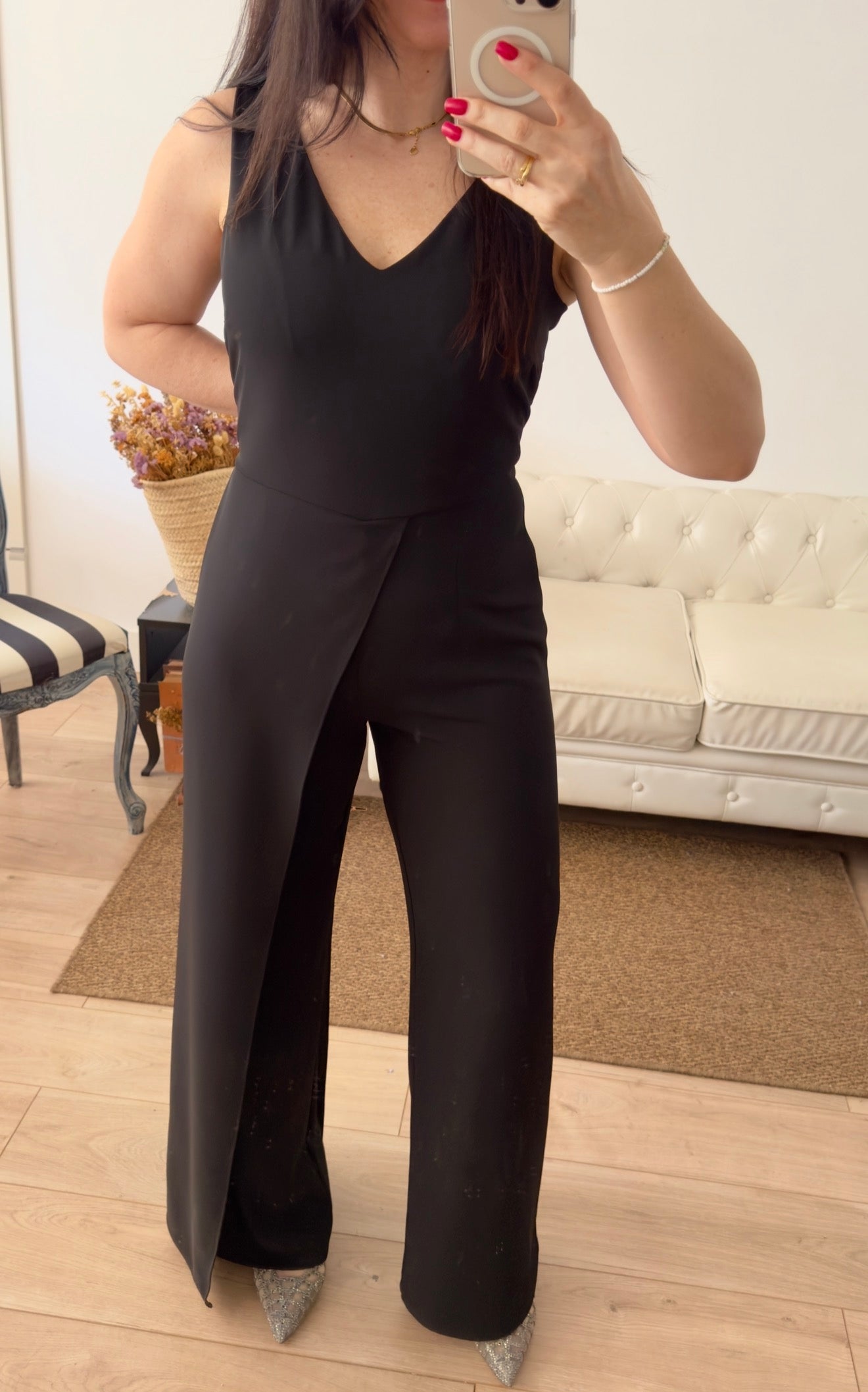 Mono negro de crep. Cremallera trasera. Detalle de faldón lateral.
